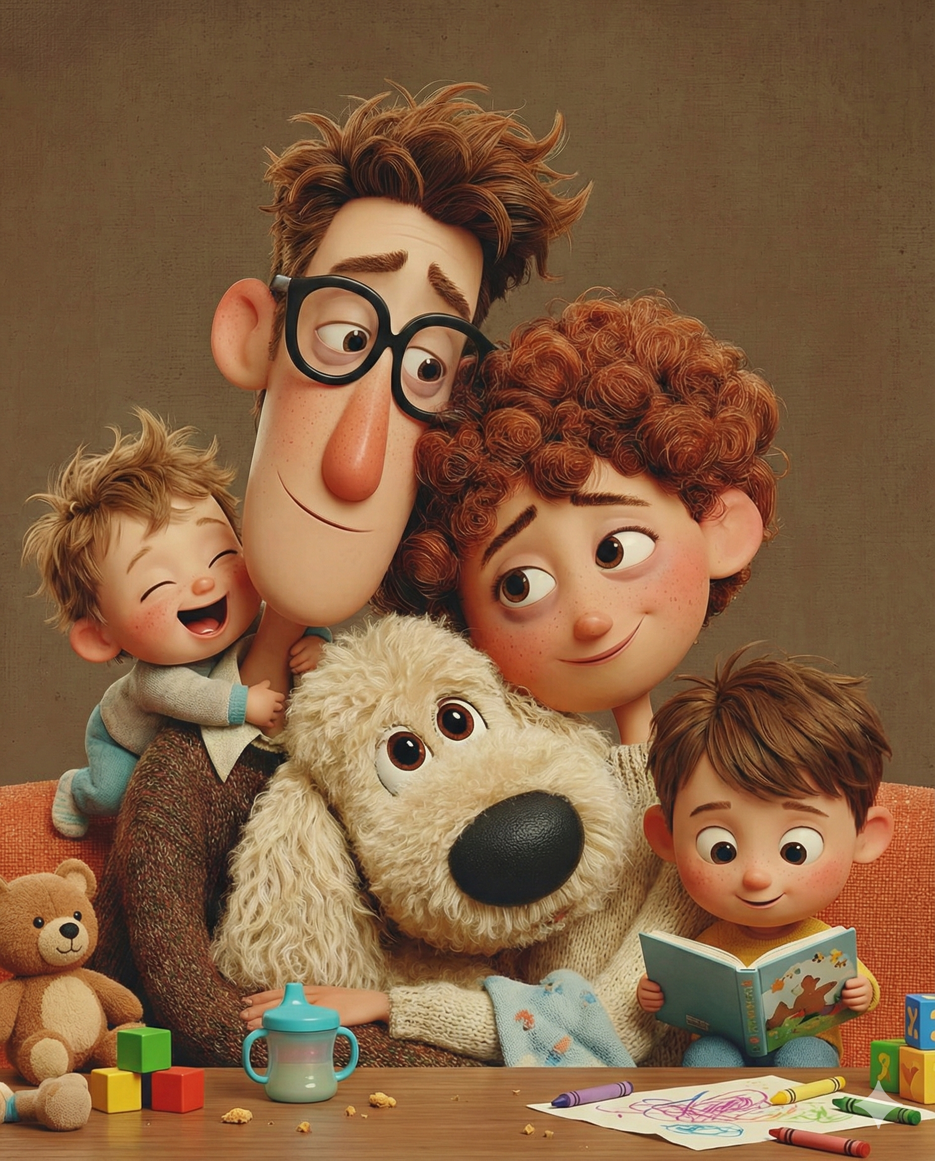Clear, well-lit photos of whoever you want us to draw. You, your person, your dog, your whole chaotic family—we're here for it. -